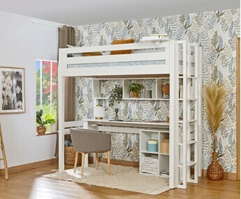 La cama alta Cancún es ideal para ahorrar valiosos metros cuadrados en tu dormitorio y crear un ambiente moderno y funcional. Bajo su estructura de cama doble elevada, se encuentra un cómodo espacio de trabajo con escritorio integrado. Una solución práctica e inteligente para dormitorios pequeños.