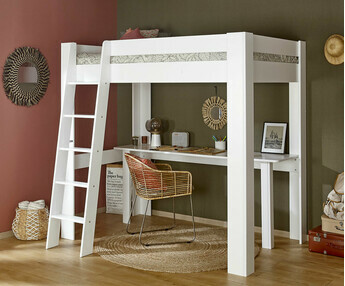 La cama alta y el escritorio están disponibles en las mismas variaciones de color: madera natural, blanco o blanco con madera. Puedes adaptar un escritorio blanco y la cama alta blanca con madera, como se muestra en las fotos. Dependiendo de la opción que elijas, tienes muebles que son de estilo rústico o más inspirados en la tendencia escandinava.