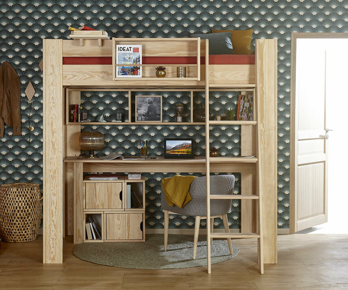 La cama alta con escritorio Naolo está fabricada completamente de madera maciza. La madera utilizada proviene de bosques gestionados de forma sostenible. La madera utilizada es de pino macizo, sin nudos, el somier es estilo parquet. La calidad de los materiales empleados confiere al mueble una gran robustez. Para mejorar la resistencia general, la cama alta Naolo tiene patas en forma de "L" con una sección de 144 x 166 mm.Ficha Técnica: Cama alta infantil con escalera de mano y escritorio - Naolo