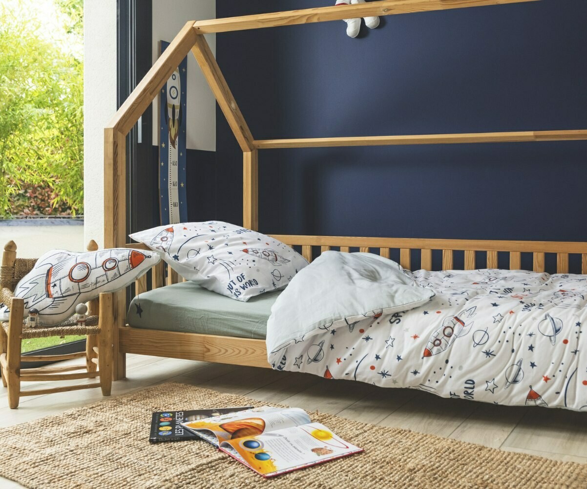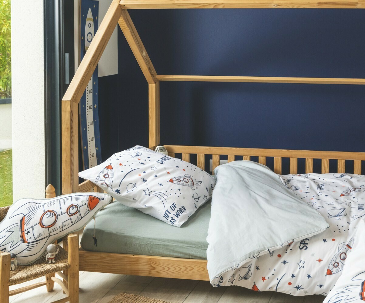Los espectaculares estampados espaciales de cohetes, galaxias y estrellas de este juego de cama infantil transforman el dormitorio infantil en un auténtico transbordador espacial. Tu pequeño astronauta partirá cada noche al descubrimiento de nuevos planetas, estimulando su imaginación y haciendo que la hora de dormir sea más divertida. Estos diseños coloridos y alegres crean un ambiente relajante que favorece el adormecimiento y el sueño reparador. La funda de almohada a juego completa armoniosamente el conjunto, creando un universo coherente en la cama infantil. Este juego de cama infantil con estampado espacial se integra perfectamente en todo tipo de decoración de habitación infantil, aportando un toque de fantasía y modernidad. Los colores resistentes a los lavados conservan su brillo con el paso del tiempo, garantizando una ropa de cama siempre atractiva. ¡Tu ropa de cama nunca habrá tenido tanto carácter!