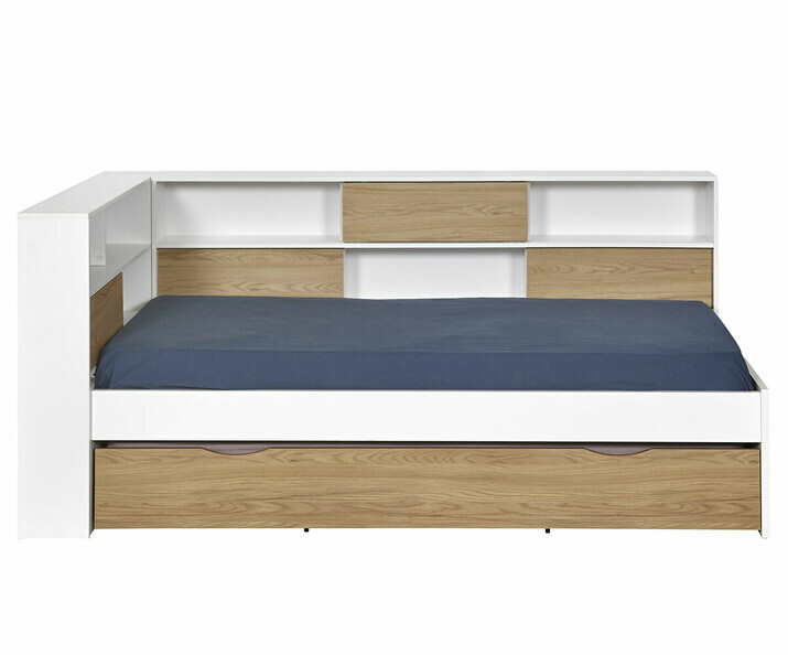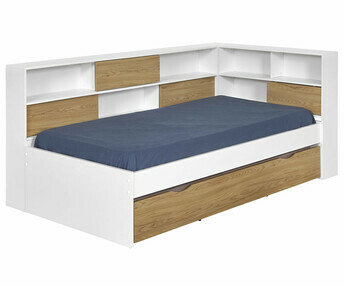 - 10 grandes estantes de almacenamiento en el cabecero y a lo largo de la cama. Cuentas con 4 puertas corredizas parauna mayor estética. Gracias a este espacio, tu hijo tendrá al alcance de la mano todo lo que necesita antes de acostarse: una caja de pañuelos, una botella de agua, una lámpara de mesa, un libro, etc. En las estanterías, tu hijo también podrá colocar los objetos que más le gusten: recuerdos de las vacaciones, fotos, un espejo, etc.