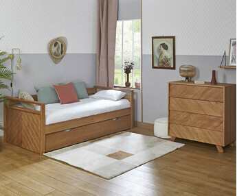 Disponible en un acabado simple y natural de color avellana, el sofá cama nido con 2 colchones Eveo se integra fácilmente en cualquier decoración. Su diseño efecto espiga le da un aspecto original y moderno. Puedes instalarlo tanto en una habitación pequeña como en tu sala de estar. De hecho, esta cama 2 en 1 puede servir como sofá. Decorado con algunos cojines decorativos, se convierte en un excelente sofá en el que puedes relajarte o conversar con tus amigos.