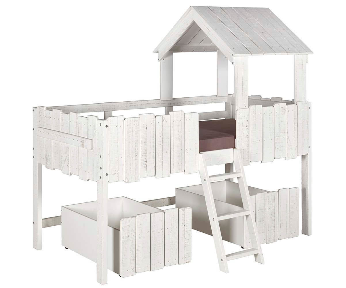 Esta cama infantil con un diseño modulable se ajusta a las necesidades del niño y del espacio disponible en la habitación, al estar elevada podrás solicitar como opcional un juego de dos cajones para colocar debajo de la casita y tener así un almacenamiento adicional para mantener el orden en la habitación.