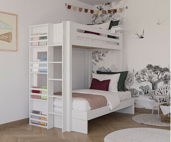 ¡Y eso no es todo! La litera de madera maciza con 2 colchones Burton está equipada con una biblioteca de cuatro estantes, porque incluso los aventureros necesitan tiempo tranquilo para explorar el mundo de la lectura. La biblioteca y la escalera se pueden colocar a la derecha o a la izquierda de la litera, según la disposición de la habitación.